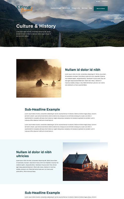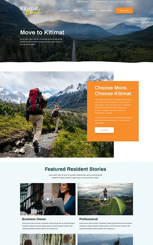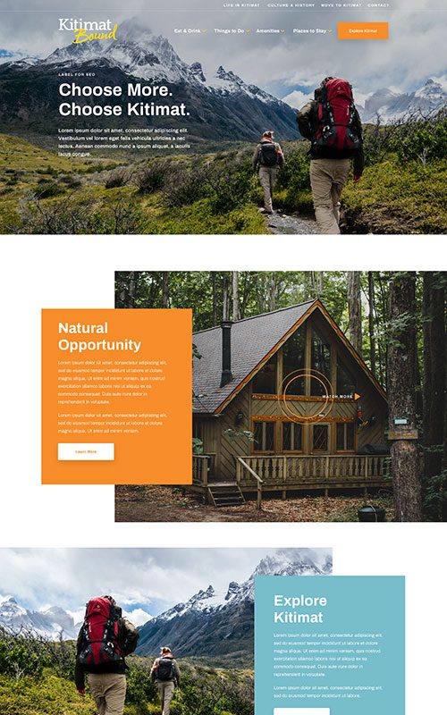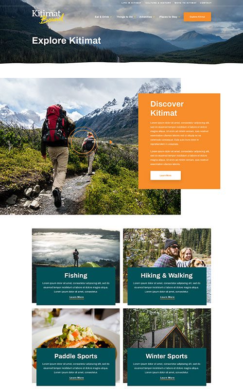 Rebrands are fun because we get to design a whole new look and feel. The purpose of this site is to encourage people to explore travel or moving opportunities to Kitimat, so we designed for big photos and enticing CTAs. The cool earth tones echo their story of adventures in pristine nature.